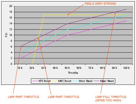 Alright, I started using MBC on my car, nd it worked great for the first couple runs, I wouldn't spike anymore, hold 18-19psi consistently, but then suddenly started overboosting in partial throttle situations....I would hold 1/4 throttle, and the boost would build all the way past 15psi.....after that started happening, I would spool until 14psi, and hit soft limp, even after a few shut down/start up cycles, I couldn't get past this limp.....I have the MBC run in between my N75 and my wastegate actuater......