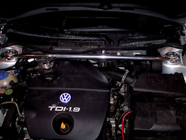 This is for a polished aluminium Mk4 front upper stress bar. It has a threaded locking adjuster and it is simple bolt in. You will have to drill 3 holes per side but it is very easy to do (not like a sway bar for eg.!) These look awesome and really add some shine to an otherwise sea of black plastic in our engine bays. We will leave the subjective arguements out of this concerning stress bars on an Mk4 but I have measured at least 6mm of flex between shock towers on a 20th anniv by just jacking up one side! Function wise a lower stress bar should probably be added in conjuction (as is the case on the A chassied S3) ...maybe another yub puorg later!